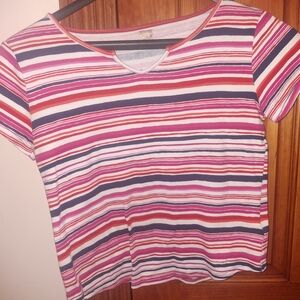 This Anne Klein t-shirt features a fitted design with short sleeves, crafted in a soft knit fabric. The pink and white color scheme adds a fresh, stylish touch to this classic top, making it perfect for casual outings. Great Condition A4