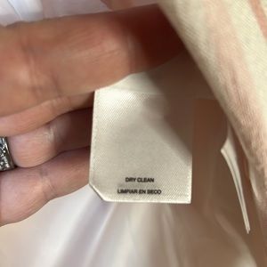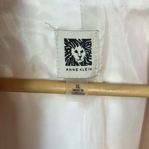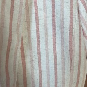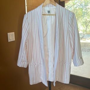 Chic Anne Klein blazer with pink and white stripes. Features rolled cuffs and open front design. Perfect for a stylish, professional look.