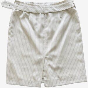 A professional women's suit by Anne Klein featuring a classic pinstripe pattern in cream with thin dark stripes.