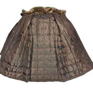 - Description: Anne Klein Rabbit Fur Trimmed Coat Sz M Brown Down Filled Belted Classic Jacket