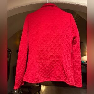 This is a vibrant red quilted jacket by Anne Klein, featuring a full zip closure and a stylish design. It is perfect for adding a pop of color to your wardrobe.