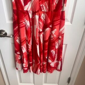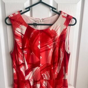 Keywords: Anne Klein dress, red and white dress, brushstroke dress, sleeveless dress, fit and flare dress, party dress, casual dress, women's dress, size 6P, petite dress, lined dress, contemporary dress, abstract print, summer dress