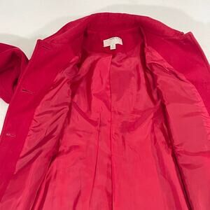 Step out in style with this stunning Anne Klein red wool blend pea coat! This women's size XL coat is perfect for adding a pop of color to your wardrobe, especially during the Christmas season. The single-breasted design offers a classic and elegant look that can be dressed up or down.