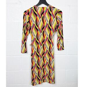 wrap dress, faux wrap, geometric print dress, retro swirl dress, multicolor dress, Anne Klein dress, party dress, office dress, stretchy dress, 3/4 sleeve dress, bodycon wrap, vintage style dress, y2k fashion, size 2 dress, colorful print dress, polyester elastane dress