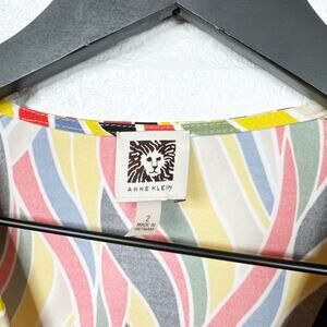 Anne Klein faux wrap dress in a colorful geometric swirl print with 3/4 sleeves and side tie detail.