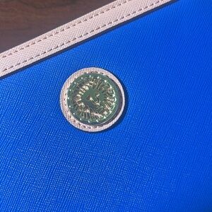Anne Klein Royal Blue and Peach wristlet. With rose gold interior. 8 1/4 inches long and almost 5 inches high. Small zip pocket on the inside. 2 large pockets for bills and 6 card holders. Vegan leather with texture. Gold zipper and lion. Big enough to fit my iPhone 13 max pro with room for a lip liner and gloss. In perfect condition. No scratches or wear marks. In perfect like new condition. I’m not sure if it was ever used it was a gift from an ex slightly before the break up so it’s been in a box. Smoke free household.