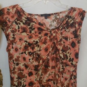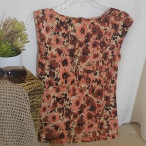Coral and brown colors with ruching detail to one side! Soft stretch fabric. Will go with anything! Fabulous modern floral print! Looks like a watercolor painting!