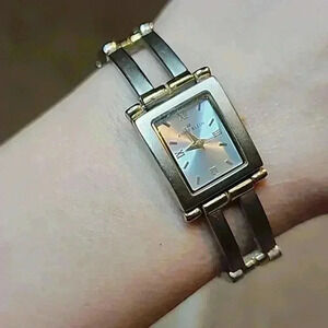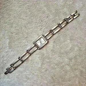 This watch from Anne Klein has rectangular links in a soft, satiny silver tone with accents in a brilliant gold. Please see the photos and the video for condition. It has a stainless steel back and Thailand movement. Great for brunch, the office, or daytime events.