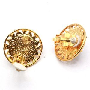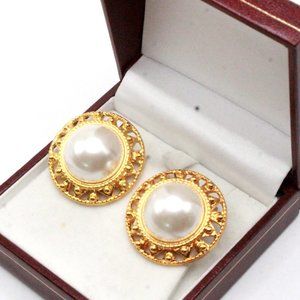 These exquisite designer earrings by Anne Klein, crafted in the 1980s, are a rare find as they are New Old Stock. The earrings showcase a beautiful faux pearl set on a round gold-plated base with intricate cut-out designs. Marked with the iconic "AK" logo, these earrings are an authentic piece from Anne Klein. In mint condition, they have been well-preserved over the years. With a convenient clip-on clasp, these earrings measure 1 1/8" in diameter, making them an elegant and timeless addition to any jewelry collection.
