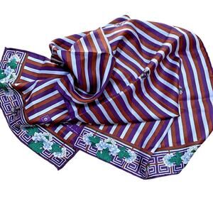 Vintage Anne Klein silk scarf - a long rectangle with hand rolled edges and an amazing striped & floral design. The lovely colors are purple, blue/gray, burgundy and dark green - stripes, Greek key, floral and medallion designs. No tags but the drape and feel reveal this is pure silk - logo is printed in one corner - this is a quality piece from a much loved designer. Gently worn - no flaws - just stunning!