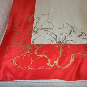 Unique and rare, this vintage silk scarf by renowned designer Anne Klein is a classic example of simplicity and elegance. The complete center of the scarf is a rich cream color, trimmed by a deep red 5.5 inch border. Each corner shows off a shimmery gold floral design from the cream down into the red. Her signature is in white on one of the corners. With a rolled hem, this scarf certainly epitomizes fine craftsmanship. Worn only once, it is in pristine, like new condition and would make a fabulous addition to your Holiday accessory wardrobe.