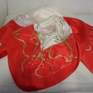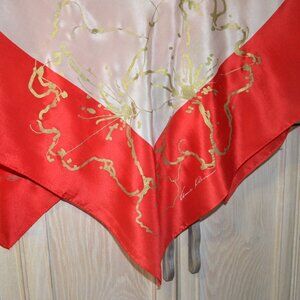 Anne Klein Silk Scarf, Signed, 40 Inches Square, Vintage Cream and Red with Gold