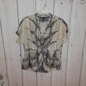 Up for sale is a stunning Anne Klein Suit Women's Size 14 100% Silk dark blue & ivory animal snake print short sleeve gathered v neck bust shirt. 12" side zip. Batwing.
