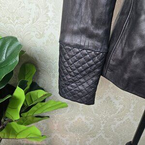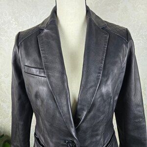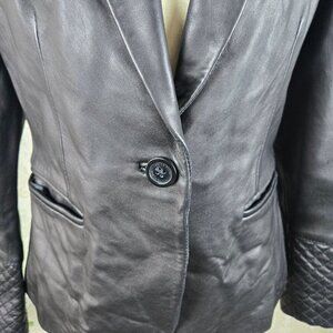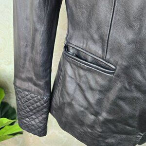 Buttery soft leather blazer in black is a perfect wardrobe staple. One button with logo as front closure. Two front pockets. Quilting accents at cuffs and across the shoulders in the back and wrapping to the front of the shoulder. Fully lined. Extra buttons in a bag in the left pocket.