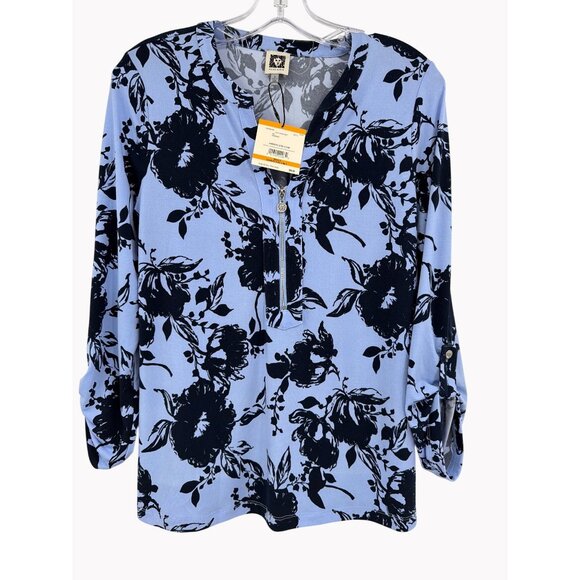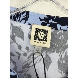 Anne Klein Size S Floral Split Neck Blouse Navy Light Blue Button Tab Sleeve New
