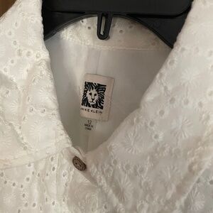 Elegant eyelet detailing adds feminine charm to this shirtdress from Anne Klein.