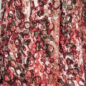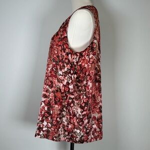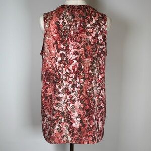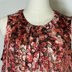 Anne Klein Sleeveless Top Blouse Women’s Size Large. Pleated front, lightweight, pink and brown abstract print, wear tucked or untucked. Very good preowned condition. Approximate measurements 28” top of shoulder to hemline, 21” across chest.