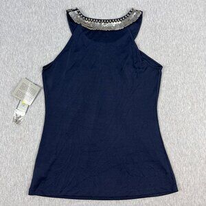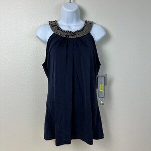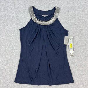 Anne Klein Sleeveless Top Womens L Navy Blue Silk Nylon Round Neck Metal Sequins