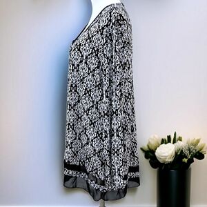 This chic tunic boasts an intricate black and white ornate pattern, creating a timeless yet striking look. The flattering V-neckline adds sophistication, while the flowy cut ensures comfort and ease of movement. Versatile for any occasion, this eye-catching piece is perfect for dressing up or down. Elevate your style with this Anne Klein piece! ✨🛍️