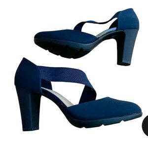 These Anne Klein Sport heels feature a sophisticated blue hue with a modern block heel design. The closed toe and cross-strap detail add a touch of elegance, making them perfect for professional settings or formal occasions. Crafted with a suede-like finish, these pumps offer both style and comfort.