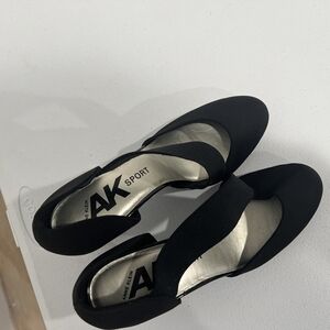 Anne Klein Sport Xoey Black Suede Heels/Pumps with Strap SZ 10. Worn once. Condition is very good, see photos, very little wear and tear. Sole and heel have tread to avoid slipping.