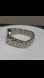 Brushed silver & shiny gold toned, diamond chip accents on the bezel & at 12 o'clock. Mother of Pearl face, blue crystal accent on the crown. Water resist 100. Very good pre-owned condition, almost no signs of wear. WILL NEED A BATTERY