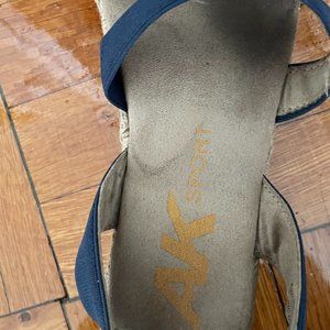 Super comfortable Anne Klein Sport strappy navy blue flatform sandals. I have had them for 4 years and they are still in great condition. They are for jeans, a dress, and everything in between. The light inside lining reflects my 4 years of wear, but they are newly cleaned to the best of my ability!