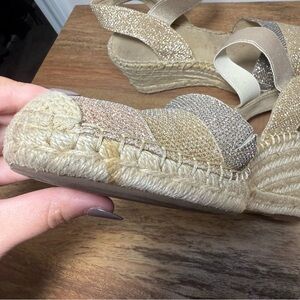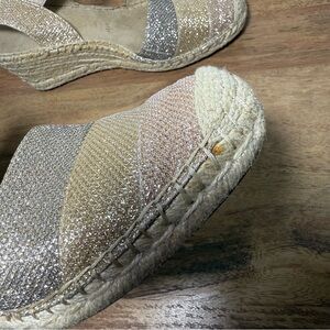 Elevate your style with these chic wedge sandals. Featuring a blend of gold, silver, and cream colors, these shoes are perfect for any occasion. Enjoy comfort and elegance with every step.
