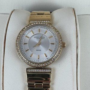 Vintage Anne Klein Swarovski Crystal Gold Tone Ladies Watch 12/2258SVGB Swiss Movement Mineral Crystal adjustable band New never worn store display great watch for work and meetings just glance at this fabulous watch politely and not use your phone.When going out after work later that night it’s more fashionable with the crystals sparkling in the night lights. Rich Guilloche Silver Enameled Dial with Crystal Hour markers Gold Hands and raised accents 2002 Swiss watch