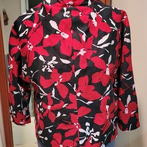 Beautiful Anne Klein Blazer with floral design with detailed collar. Red Flowers on black with white accents. Lovely collar and 3/4 length sleeves. Large black buttons.