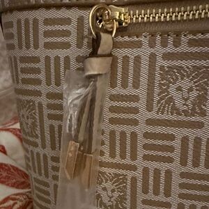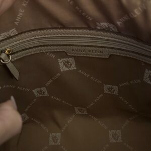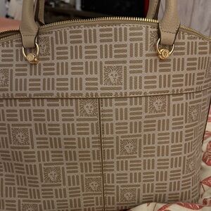 Chic Anne Klein satchel with a geometric design. Features a stylish tan pattern and gold accents. Ideal for everyday use.