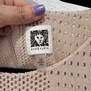 This pre-owned Anne Klein dress is crafted from a crochet-style fabric in a chic tan color and features a sophisticated sheath silhouette. Its distinctive open-knit pattern makes it perfect for casual outings. The sleeveless design with a halter neckline adds an elegant touch, while the midi length, reaching around mid-calf, provides a modern and versatile look.