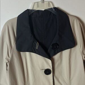 Stylish trench with black collar. Button front and pocket accents. Perfect for any occasion.