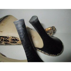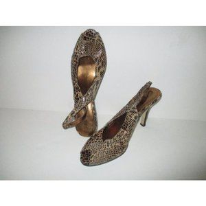 Stylish! Anne Klein Taupe Glossy Lizard Print Open Toe Slingbacks. 1.5 inch open toe lizard skin print pump with 4 inch walnut stacked heels. 1.5 inch wide elastic strap back fastening. US 11. All measurements are approximate. J0715