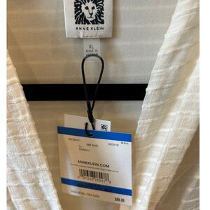 AK tie neck cream colored blouse in a size XL. The blouse is new with the tags. Measures approx 25" long and 23" pit-to-pit. Viscose/nylon fabric with some stretch.