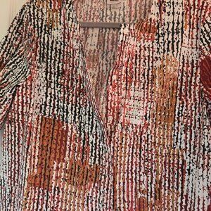 This top features a vibrant, abstract pattern with vertical, textured-looking streaks in multiple colors—including maroon, black, white, tan, and hints of rust. The design creates a dynamic, almost hand-painted effect.