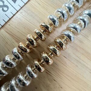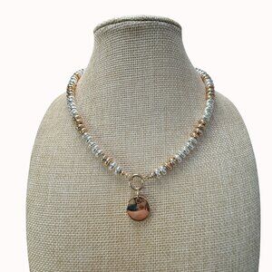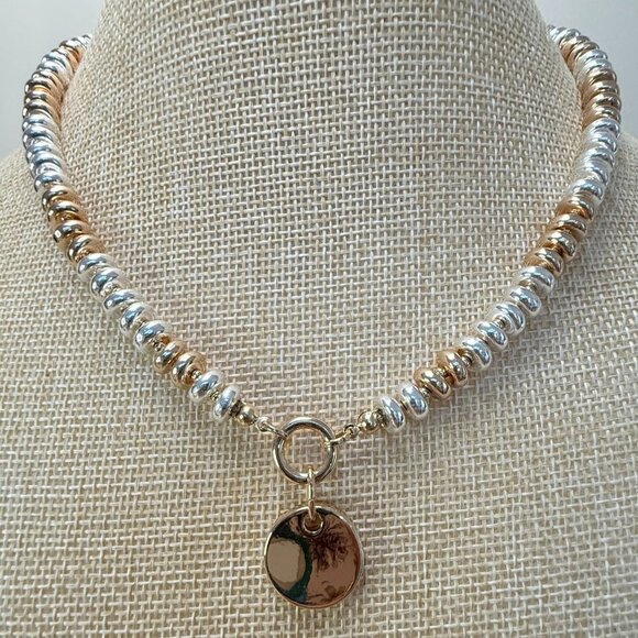 A polished and versatile necklace featuring silver and gold-tone beads paired with an elegant disc charm. An ideal accessory for professional attire.