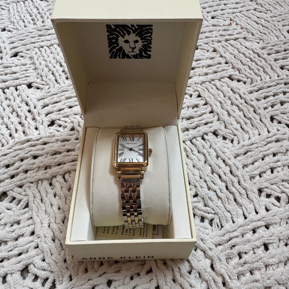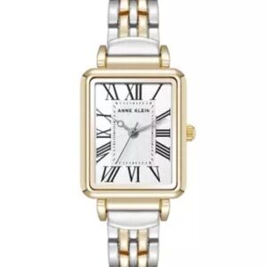 Chic Anne Klein watch with a two-tone design. Rectangular face with classic Roman numerals.