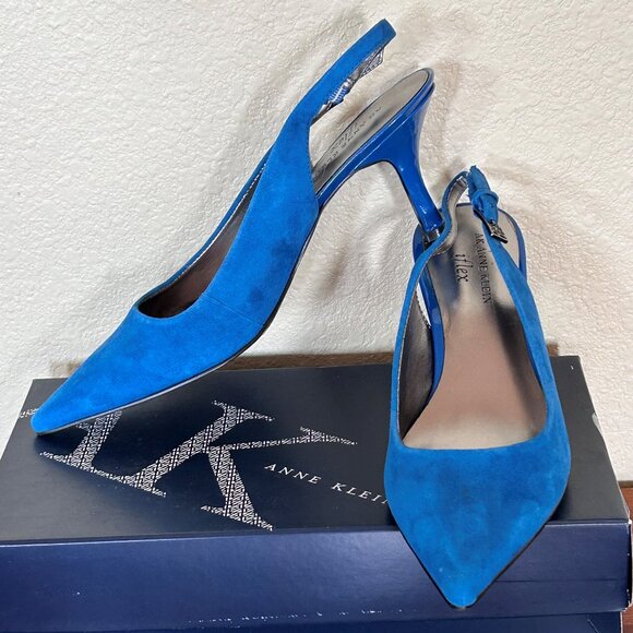 Anne Klein slingback heeled shoes are a vibrant blue suede with a patent heel and dark titanium colored buckle. Worn once on carpeted surface only. Size 8 ½ M