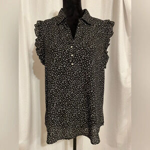 Tank top has ruffled sleeves with three pearl button closures on v-neck. Gently worn and in excellent used condition.