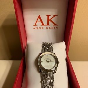 Anne Klein watch with a multiple silver tone chain with crystal studded band. Mother of pearl face.
