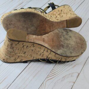Anne Klein Wedge Sandals Gold & Black Straps Size 8.5 Pre-Owned Great Condition