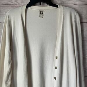 White or off-white cardigan sweater by Anne Klein. This long sleeve cardigan has partial button up front that forms a v neckline when buttoned. There are pockets with matching gold button closures on the bottom front. There is a ribbed band at the bottom of the sleeves and cardigan. It is pre-owned with pilling or fuzziness, subtle wear or tarnishing to the buttons, and discoloring in the armpits.