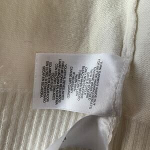 White or off-white cardigan sweater by Anne Klein. This long sleeve cardigan has partial button up front that forms a v neckline when buttoned. There are pockets with matching gold button closures on the bottom front. There is a ribbed band at the bottom of the sleeves and cardigan. It is pre-owned with pilling or fuzziness, subtle wear or tarnishing to the buttons, and discoloring in the armpits.