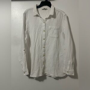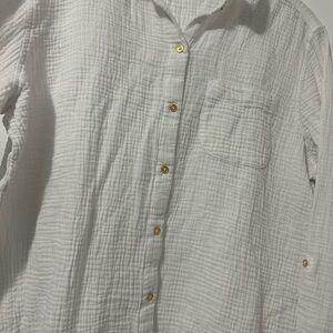 Keywords: Lightweight, Breathable, Textured cotton, Button-down shirt, White blouse, Relaxed fit, Collared top, Casual chic, Versatile, Rolled sleeves, Everyday wear, Summer essential, Minimalist, Layering piece, Soft fabric, Pocket detail, Effortless style