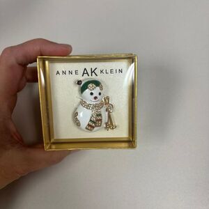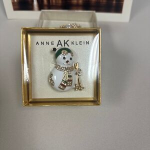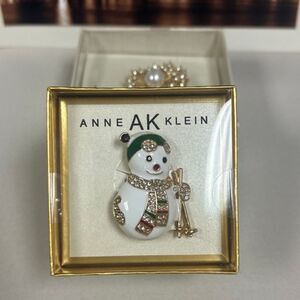 Anne Klein White Green Red Gold Tone Rhinestones Skiing Snowman Brooch