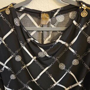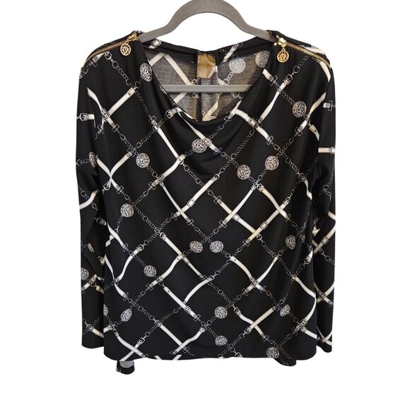 Anne Klein Woman SZ L Bit and Chain Print Knit Blouse Zipper Shoulder Scoop Neck