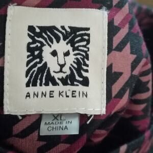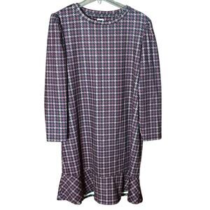 Anne Klein, Women XL, Red Burgundy/ Gold Houndstooth Pattern, Round Neck, Puff Long Sleeve, Sheath Midi Length with Flare Hem Dress