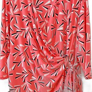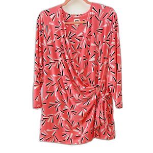 This new Anne Klein Women's Faux Wrap Blouse is available for purchase in size 2X. The blouse features a stylish V-neckline and 3/4 sleeves, making it perfect for both career and casual occasions. Made of lightweight and stretchy polyester fabric, this blouse is easy to care for and suitable for all seasons. The geometric pattern in black and white on the peach background adds a touch of sophistication to the timeless and classic design. With a comfortable fit and plus size option, this blouse is a versatile addition to any wardrobe as it offers a timeless style. This blouse comes from a smoke-free home and has never been worn!