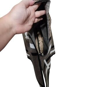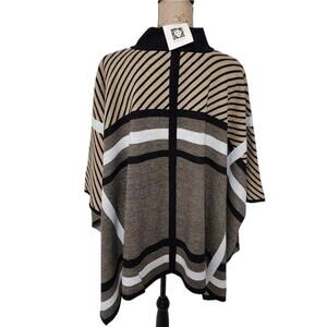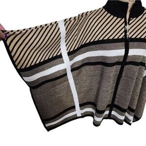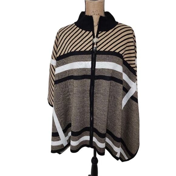Wrap yourself in sophisticated comfort with this Anne Klein knit poncho sweater. The striking geometric pattern in rich earth tones of taupe, black, white, and beige creates a visually captivating design that's both modern and timeless. A convenient full zip front and a stand-up collar offer versatility and warmth, perfect for layering over your favorite tops. The flowing silhouette drapes beautifully, providing an elegant and relaxed fit. Ideal for a casual day out, a cozy evening at home, or adding a stylish layer for cooler weather.